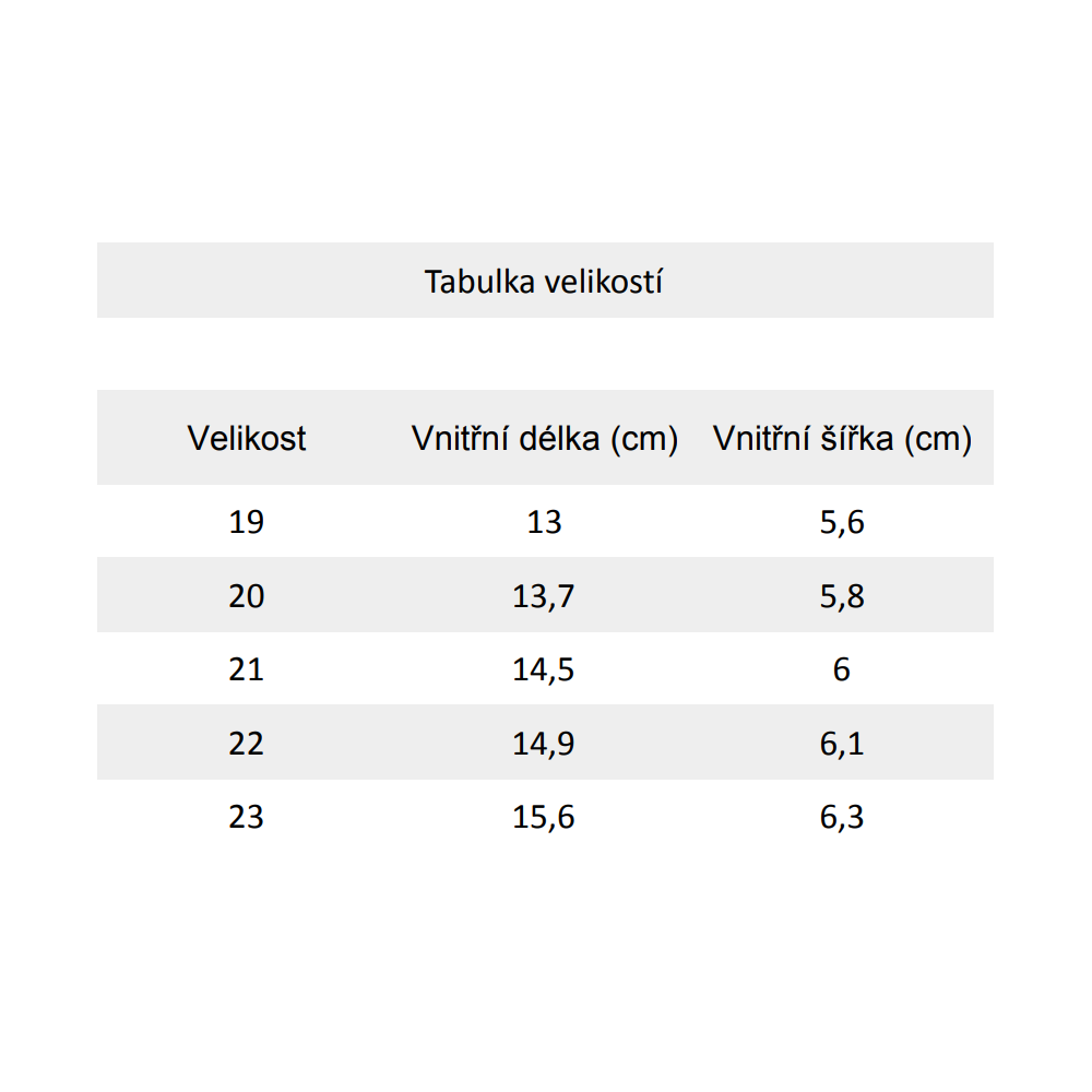 Velikosti - 20 - 13,7 x 5,8 cm, 21 - 14,5 x 6 cm, 22 - 14,9 x 6,1 cm, 23 - 15,6 x 6,3 cm